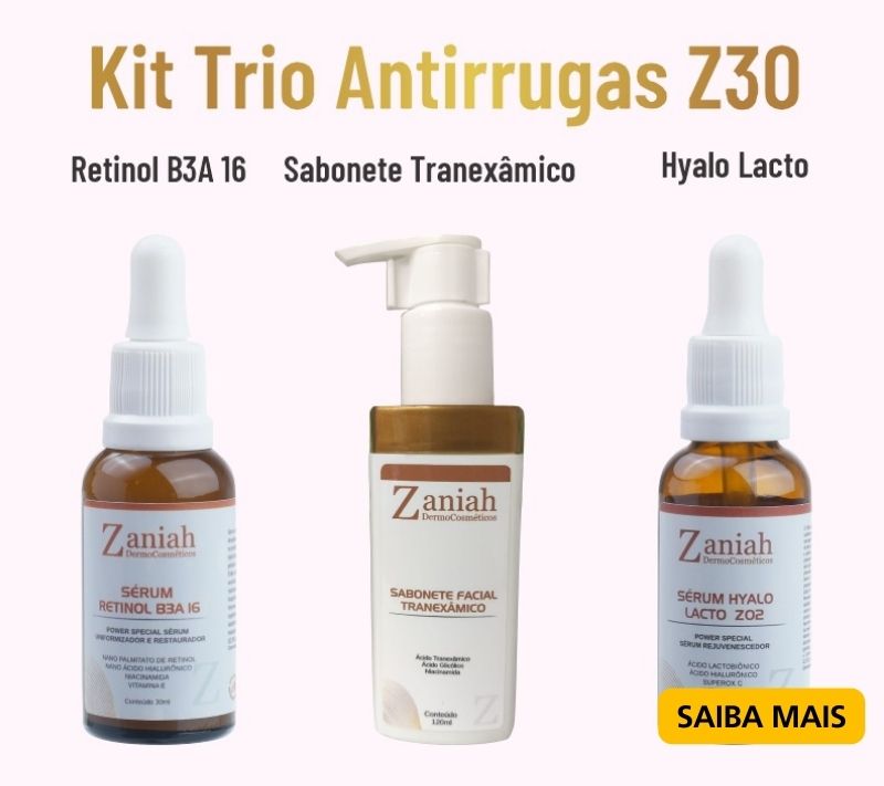 - Melhor Custo Benefício – Tratamento Antirrugas Zaniah Z29: Kit Tranexâmico, Retinol B3A-Z25 & Resveratrol